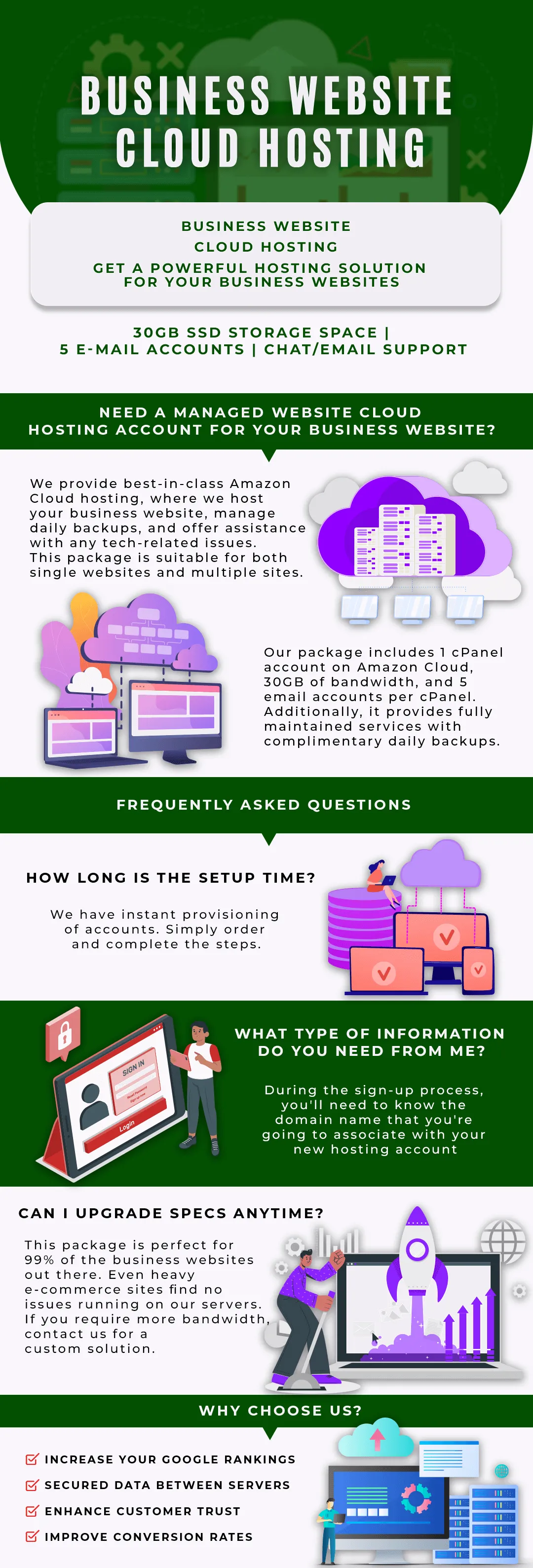 Best-in-class Amazon Cloud hosting. We host your business website, manage daily backups, and assist with any tech-related issues. This package is perfect for a single website or multiple.