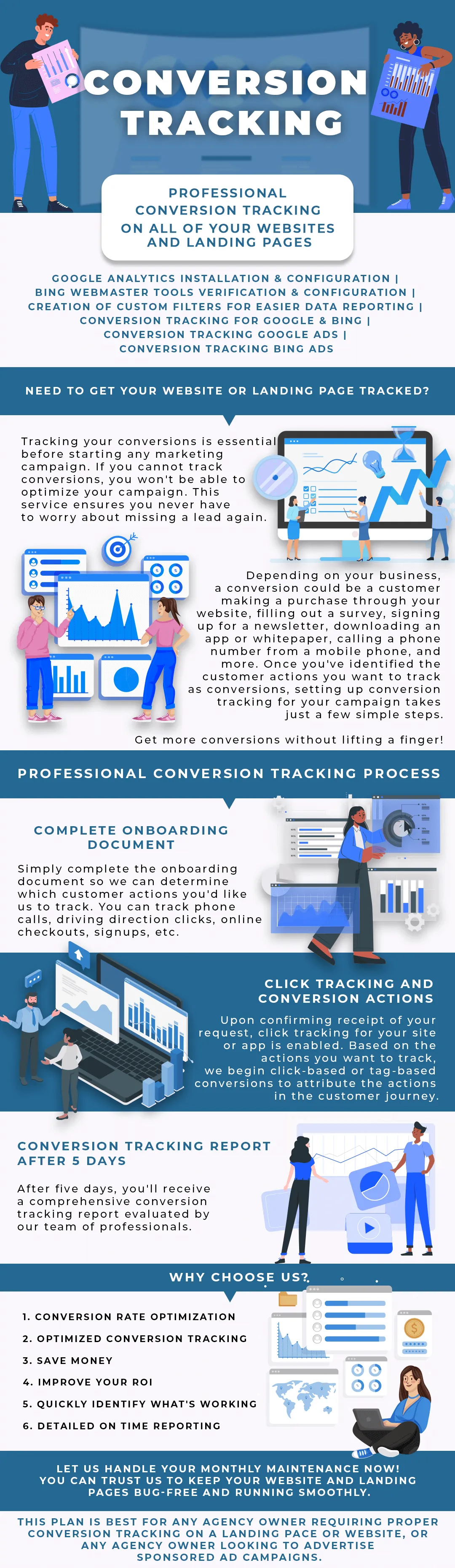 Keeping track of your conversions is the most thing you can do before starting any marketing campaign. If you cannot track conversions, you won't be able to optimize your campaign. This service covers you, so you never have to worry about a missed lead again.