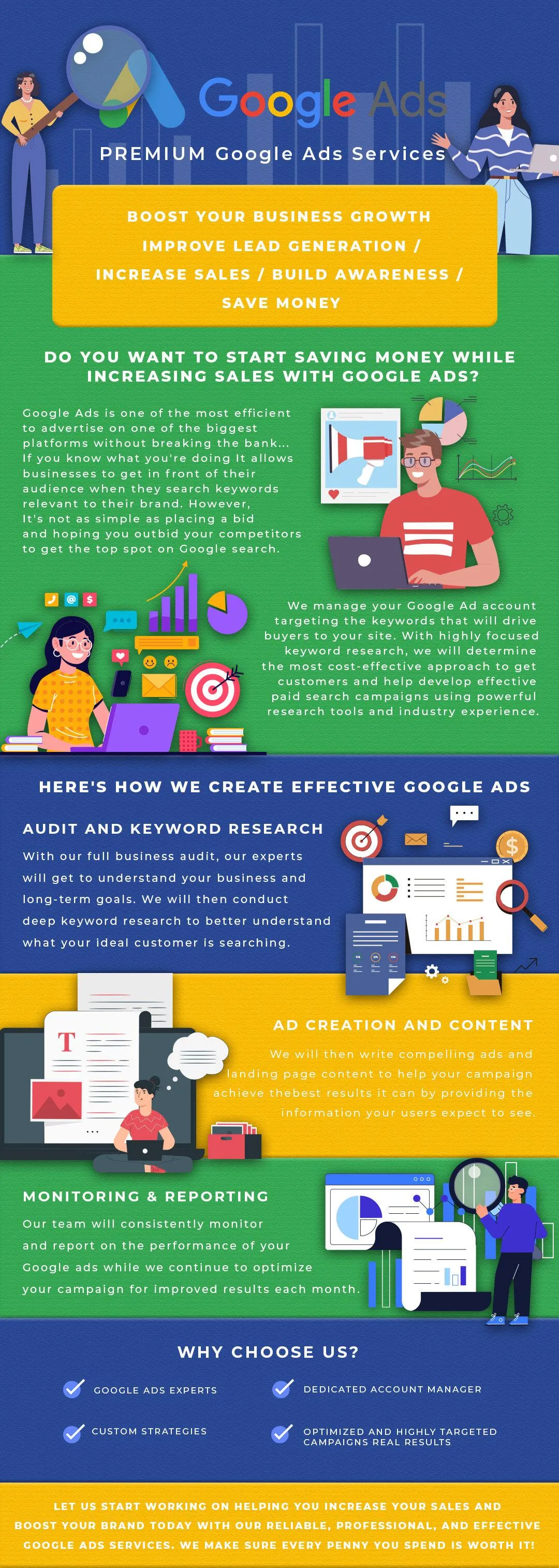 After you pay for this service and complete the onboarding document, we will start designing your new Google ad creatives. All excel files are sent to you for your approval via email before uploading your campaign to Google. If you require any changes during our approval process, we can take care of them immediately and send you the revised copies. Your PM (Project Manager) will work with you to get approval.